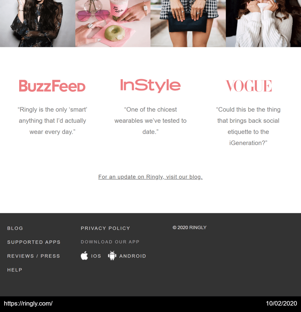 GoFullPage is the #1 solution for taking a screenshot of your entire webpage—exactly as it appears on your screen. The extension has solved this problem for capturing the vast majority of webpage designs, and does it all for free with our easy-to-install browser extension. With one click, you can capture a website like Ringly’s, and print out a PNG or PDF like this: