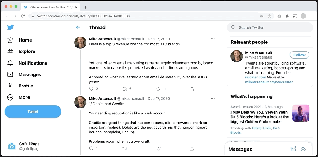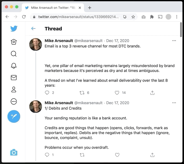 For example, we recently came across a long Twitter thread chock full of incredible information about email marketing by Mike Arsenault, founder of Rejoiner: