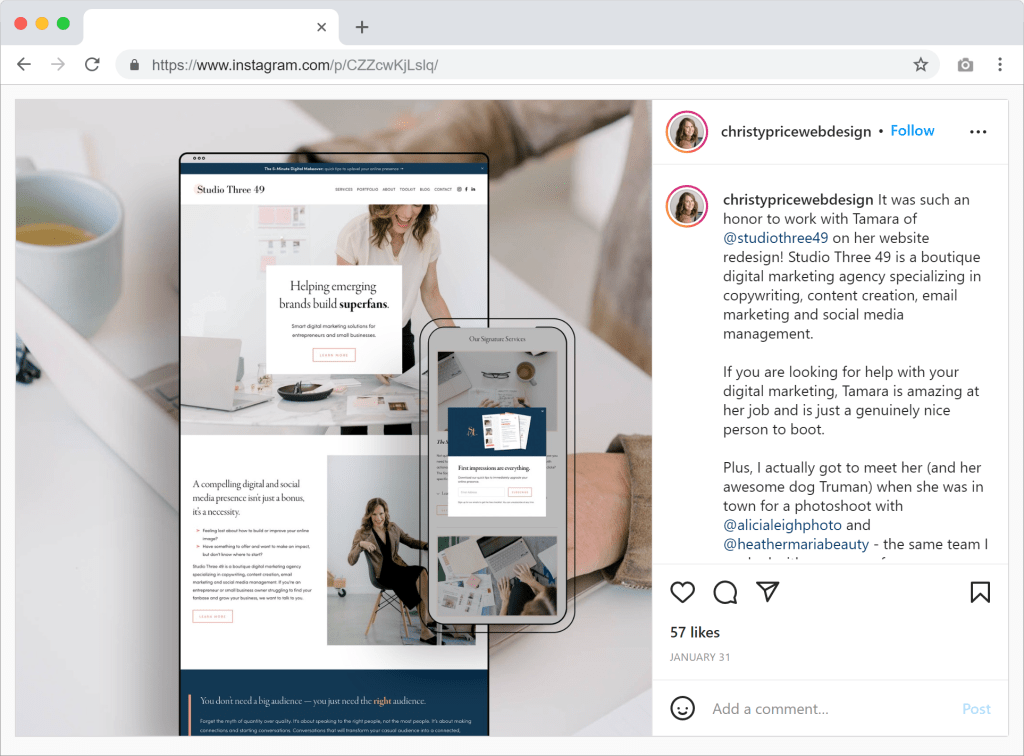 Christy also takes “Before” and “After” screenshots of each site she designs, so her clients can see how much and exactly what has changed. Squarespace sites can’t be backed up, so the “After” screenshots serve as a record of the site at launch for Christy’s own records!