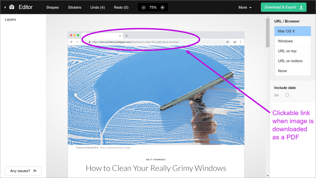 The URL can also be added automatically to every PDF saved. This means that the URL would not need to be manually added in the editor with each screenshot. This automation can be configured in GoFullPage’s “Options”.