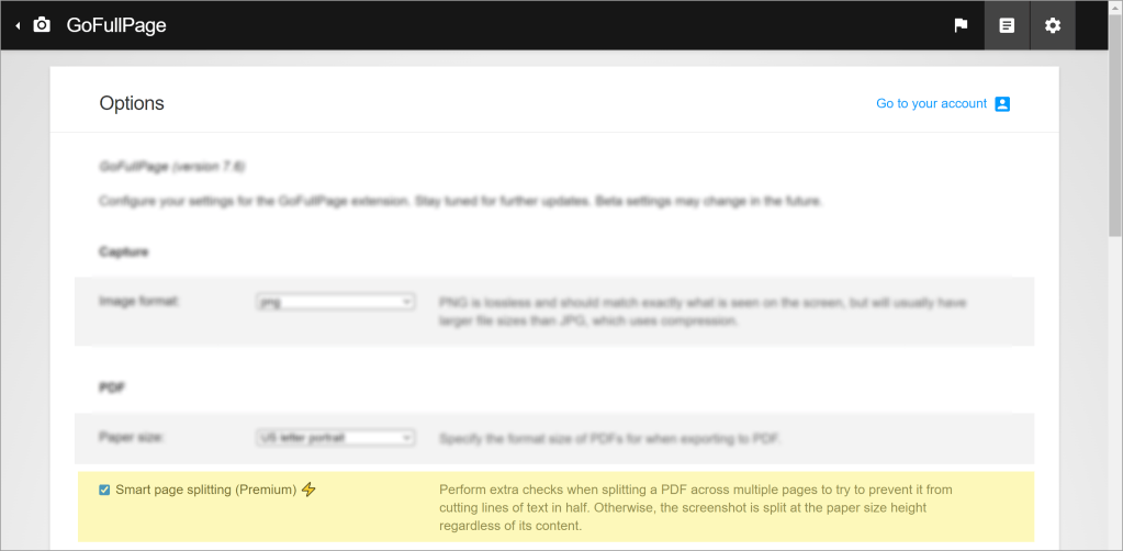 Another helpful premium feature is GoFullPage’s “Smart Page Splitting” capability. When the screenshot is saved as a PDF, the image will be scanned and page breaks will be placed so that text isn’t cut by the page break. This feature can be configured and selected in “Options”, though it is activated by default for premium users: