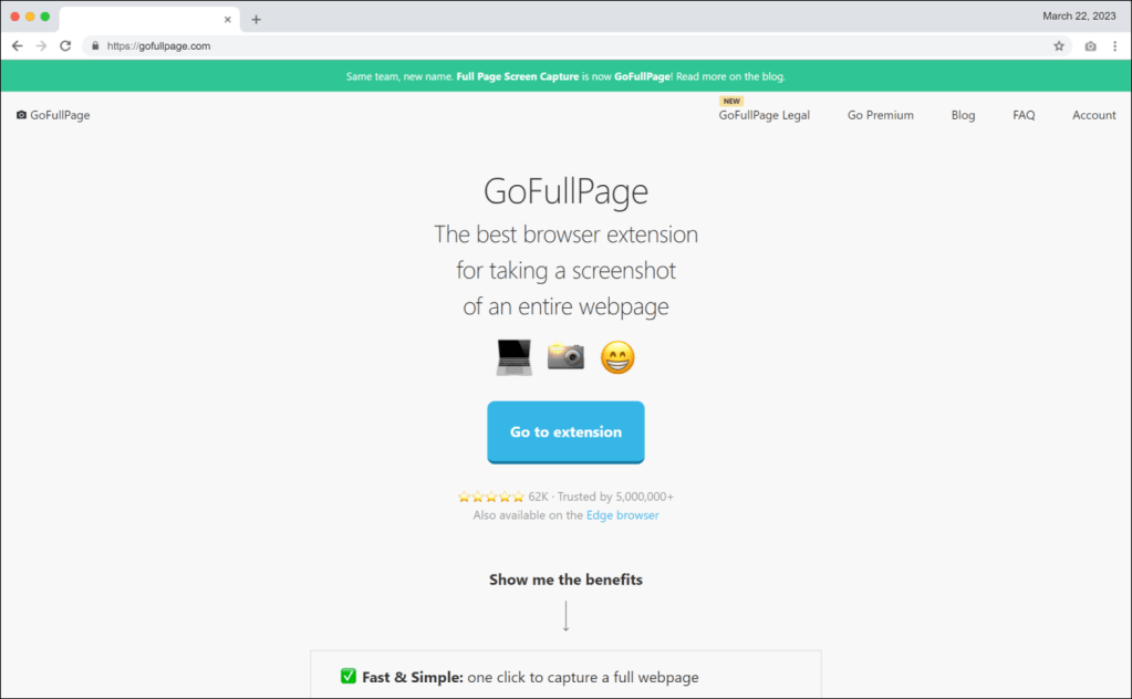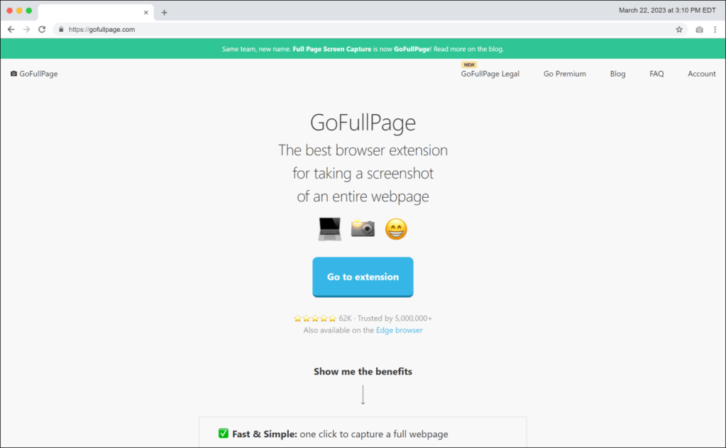 GoFullPage is the most reliable, quickest way of taking a screenshot of an entire webpage. To start screenshotting, download the free browser extension on your preferred browser: Google Chrome or Microsoft Edge.