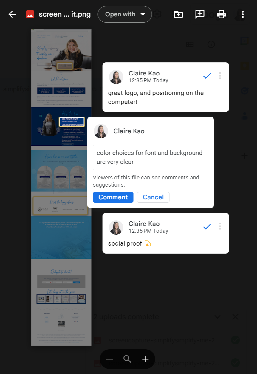 Liz shared with us a cool collaboration trick: after she takes a screenshot of an entire page in GoFullPage, she can upload it to a shared Google Drive folder. Inside Google Drive, she can highlight sections of the page and add a comment that a collaborator or client can then view and reply to.